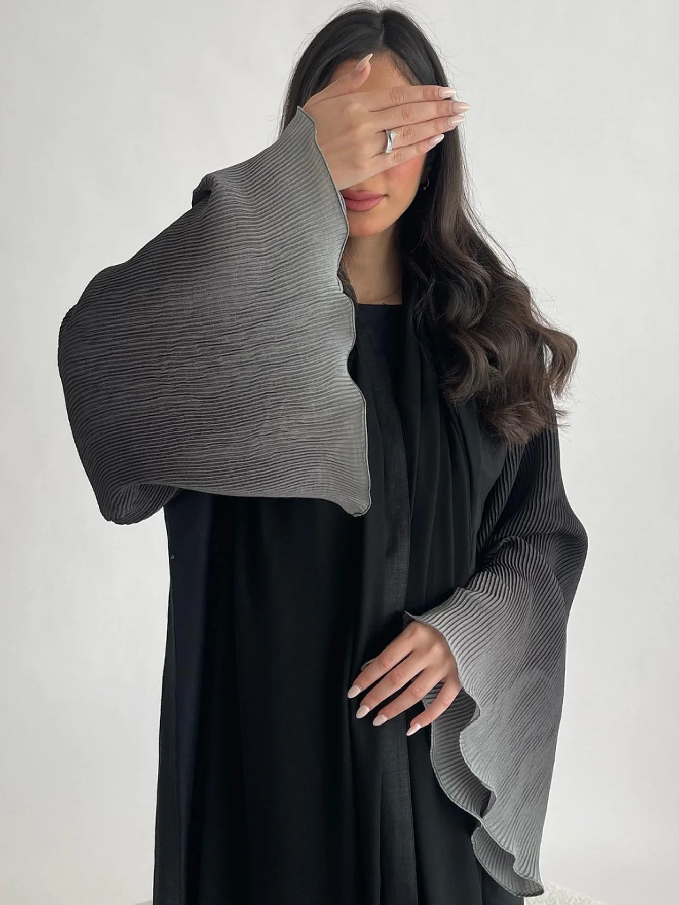عباية لطيفة، ولكن الجزء الأمامي لا يغلق لأنه ضيق جدًا في هذا القسم. أنا 5’7 والطول جيد ولكن نعم الجزء الأمامي لا يغلق وهو مفتوح تمامًا
