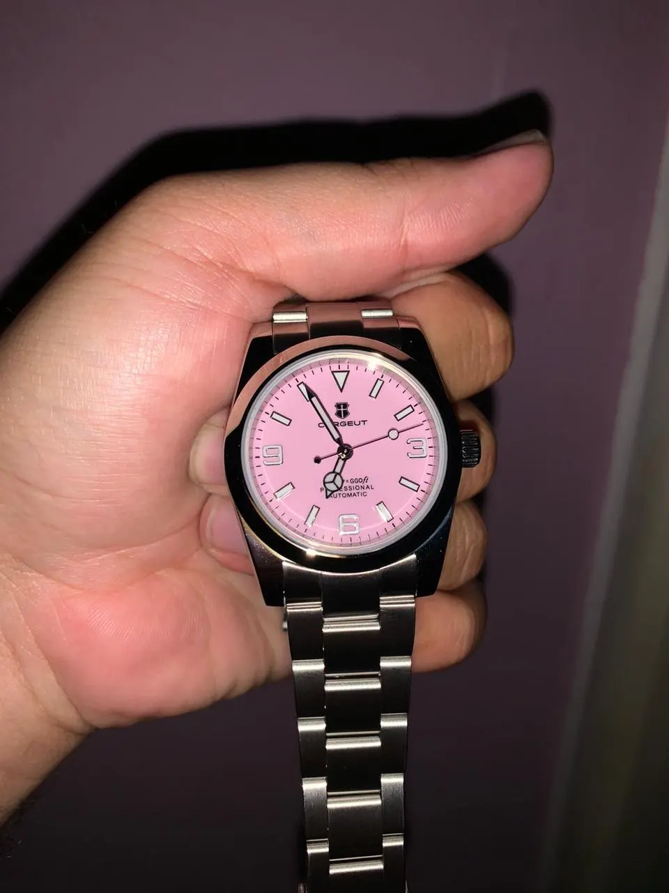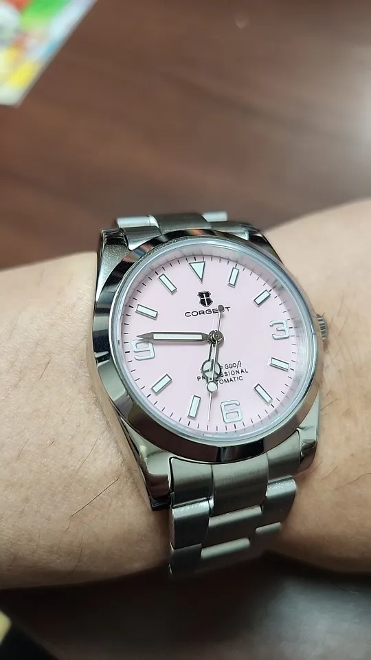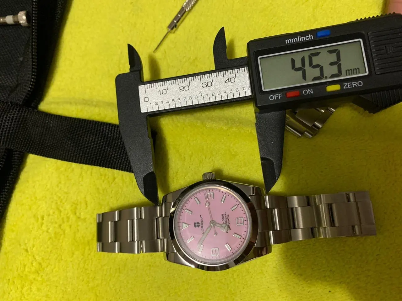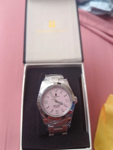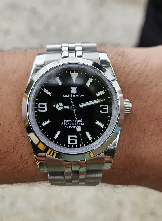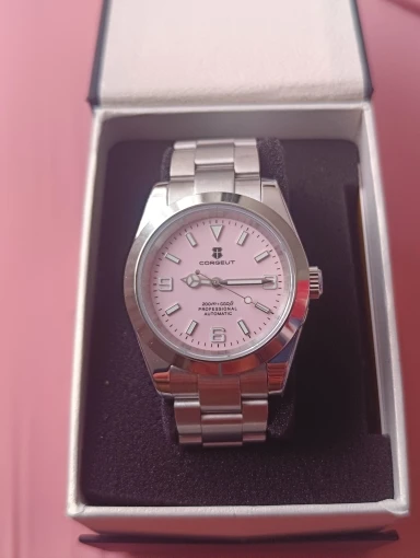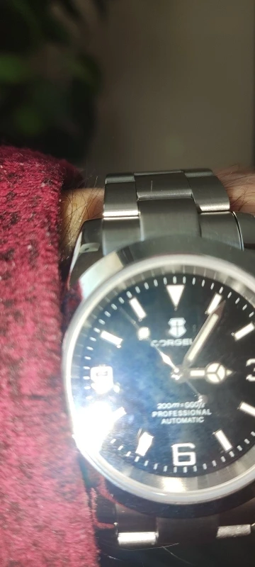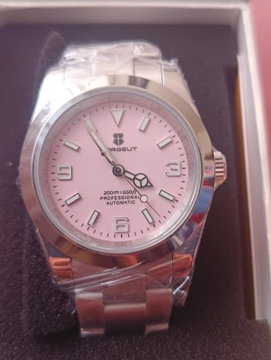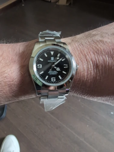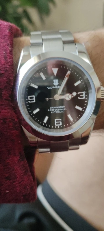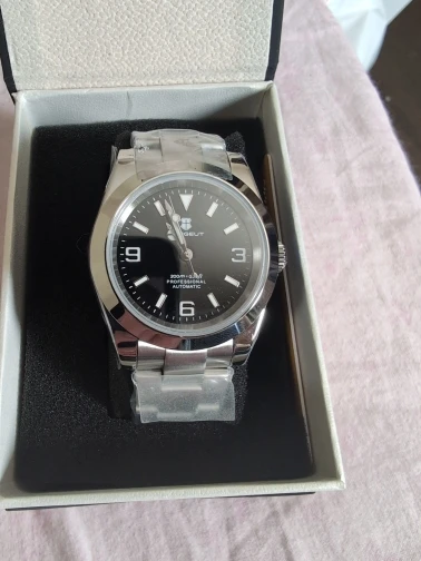 هذه الساعة فاقت توقعاتي. أردت ساعة “إكسبلورر” بحجم 39 ملم، تصميم مستوحى من الطراز الكلاسيكي مع المينا الأسود الأصلي. توجد خيارات عديدة في السوق، لكنني اخترت هذا المنتج تحديدًا بسعر 70 دولارًا أمريكيًا. في رأيي، هذا المنتج يتميز بأفضل المواصفات مقابل أفضل سعر. هيكل وسوار كاملان من الفولاذ المقاوم للصدأ 316L، وصلات صلبة ووصلات نهائية، مقاس دبوس لولبي، مشبك مطحون مع آلية قفل انزلاق سلسة، كريستال الياقوت، تاج لولبي وظهر علبة، ومقاومة للماء حتى عمق 200 متر. اخترت الطراز الأقل تكلفة 8215 بدلاً من NH35. القرص الأسود اللامع عميق وغني للغاية. فقط تحت عدسة مكبرة بقوة تكبير 30x تمكنت من اكتشاف عيوب في تعبئة اللومين على الأرقام. وإلا فإن الطباعة والمؤشرات الأخرى تكون في حالة ممتازة. السوار يتميز بحركة سلسة وقفل انزلاقي فائق السلاسة. أول تجربة لي وأعجبتني. الإضاءة جيدة، والشحن سريع، لكن الأرقام تتلاشى بسرعة. قد يكون هذا الأمر غير مهم بالنسبة للبعض، ولكنه قد يزعج البعض الآخر. قد يكون هناك اختلاف طفيف في درجة لمعان الساعة، حيث أن هيكلها مصقول بالكامل بينما السوار مطفي بالكامل، مما قد يظهر عدم تطابق بسيط عند نقاط التوصيل (lugs). لكنني ما زلت أعتقد أنه رائع وقد أحصل على آخر