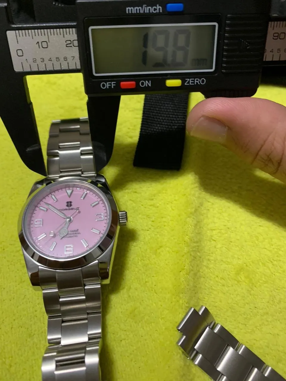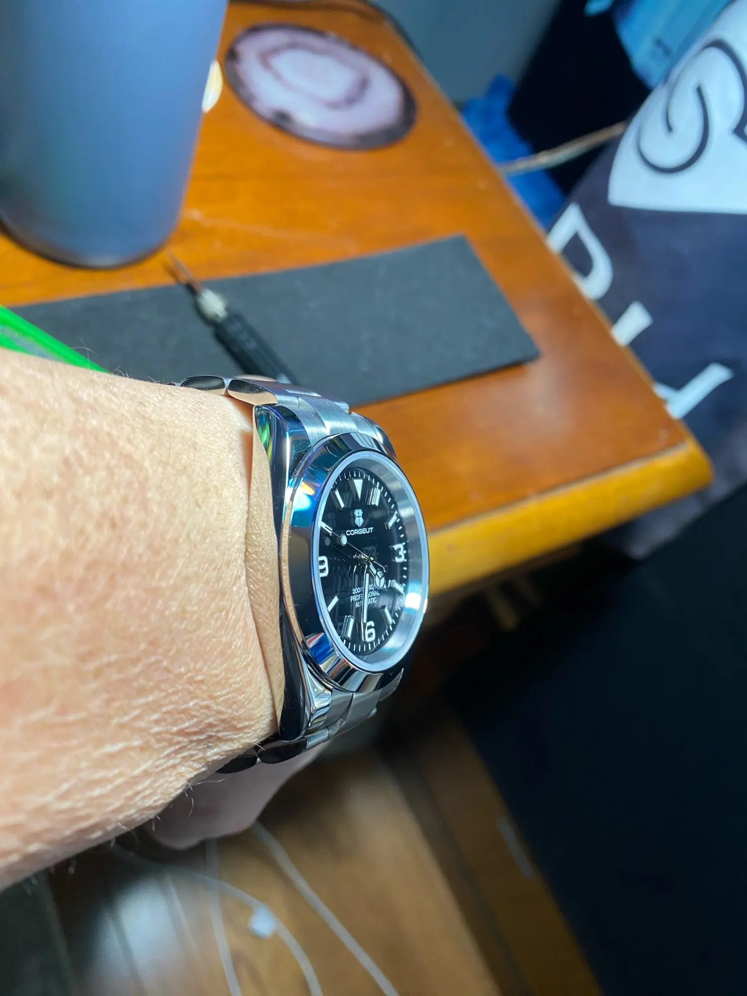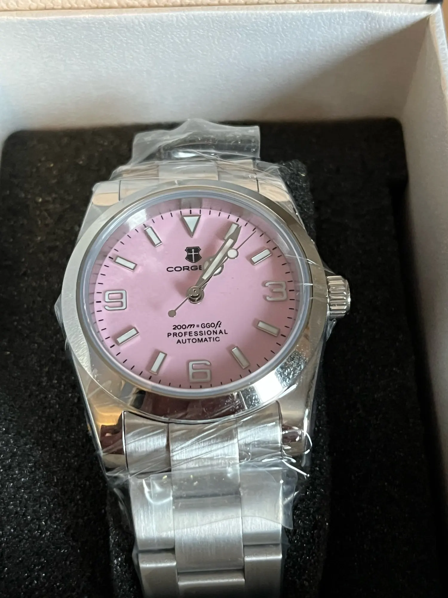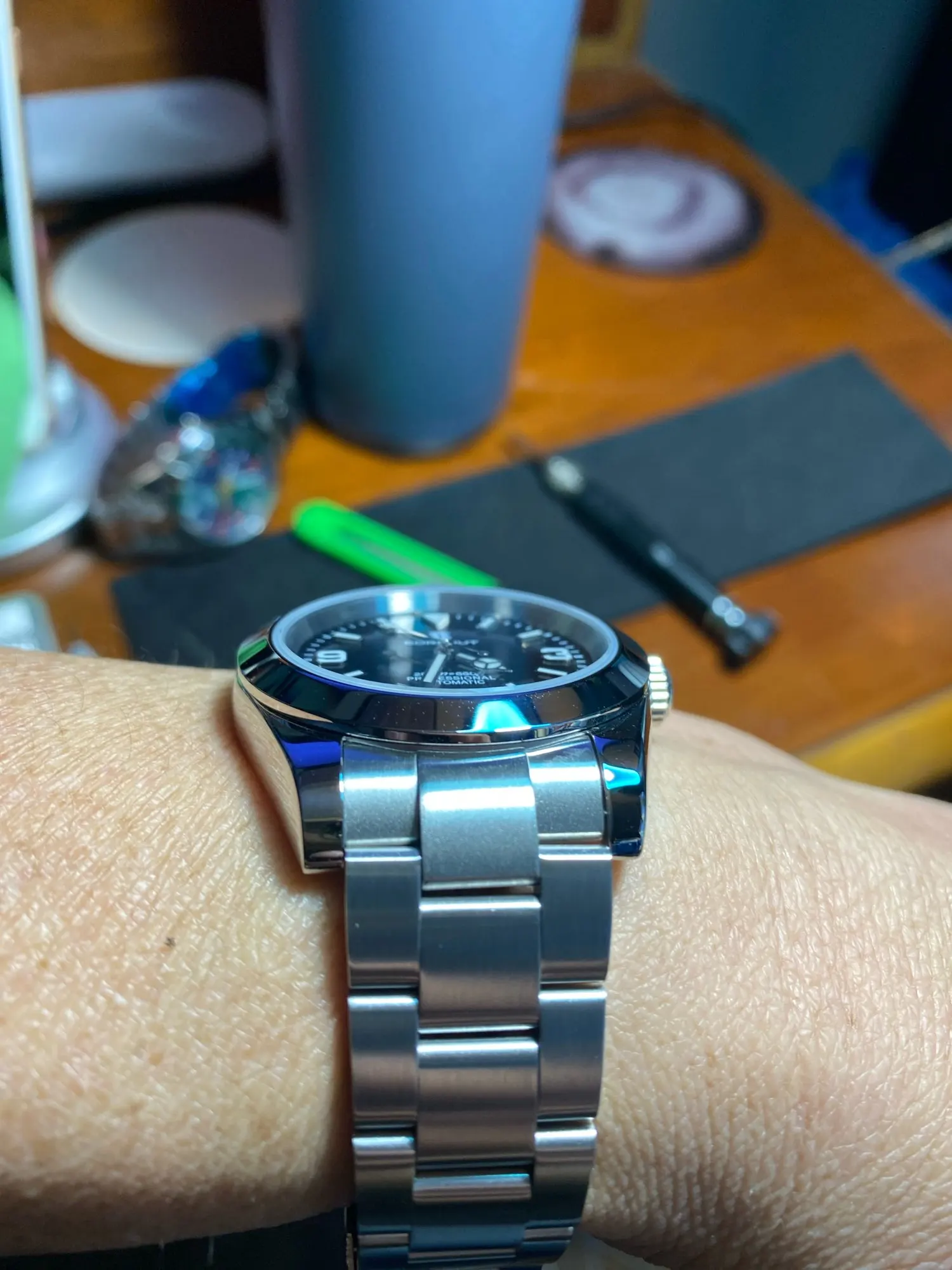هذه الساعة فاقت توقعاتي. أردت ساعة “إكسبلورر” بحجم 39 ملم، تصميم مستوحى من الطراز الكلاسيكي مع المينا الأسود الأصلي. توجد خيارات عديدة في السوق، لكنني اخترت هذا المنتج تحديدًا بسعر 70 دولارًا أمريكيًا. في رأيي، هذا المنتج يتميز بأفضل المواصفات مقابل أفضل سعر. هيكل وسوار كاملان من الفولاذ المقاوم للصدأ 316L، وصلات صلبة ووصلات نهائية، مقاس دبوس لولبي، مشبك مطحون مع آلية قفل انزلاق سلسة، كريستال الياقوت، تاج لولبي وظهر علبة، ومقاومة للماء حتى عمق 200 متر. اخترت الطراز الأقل تكلفة 8215 بدلاً من NH35. القرص الأسود اللامع عميق وغني للغاية. فقط تحت عدسة مكبرة بقوة تكبير 30x تمكنت من اكتشاف عيوب في تعبئة اللومين على الأرقام. وإلا فإن الطباعة والمؤشرات الأخرى تكون في حالة ممتازة. السوار يتميز بحركة سلسة وقفل انزلاقي فائق السلاسة. أول تجربة لي وأعجبتني. الإضاءة جيدة، والشحن سريع، لكن الأرقام تتلاشى بسرعة. قد يكون هذا الأمر غير مهم بالنسبة للبعض، ولكنه قد يزعج البعض الآخر. قد يكون هناك اختلاف طفيف في درجة لمعان الساعة، حيث أن هيكلها مصقول بالكامل بينما السوار مطفي بالكامل، مما قد يظهر عدم تطابق بسيط عند نقاط التوصيل (lugs). لكنني ما زلت أعتقد أنه رائع وقد أحصل على آخر