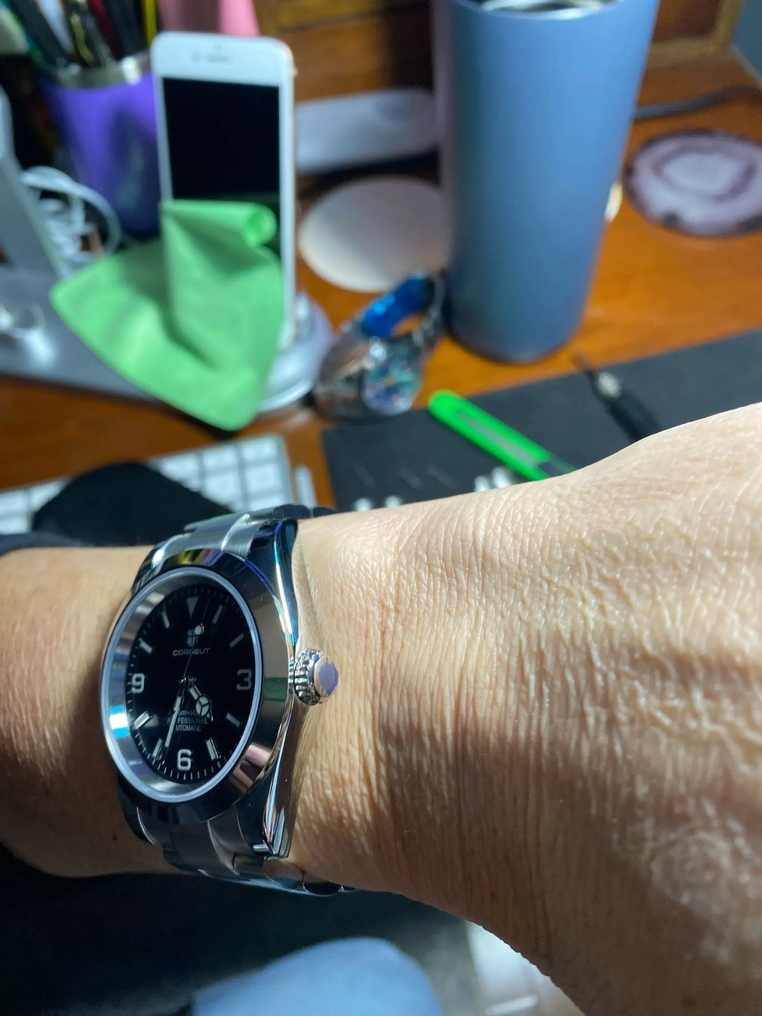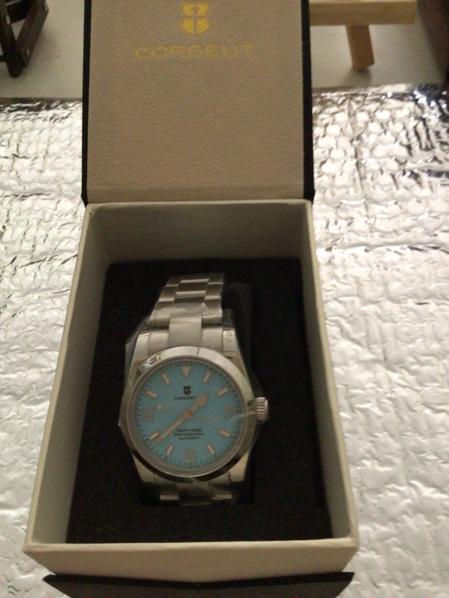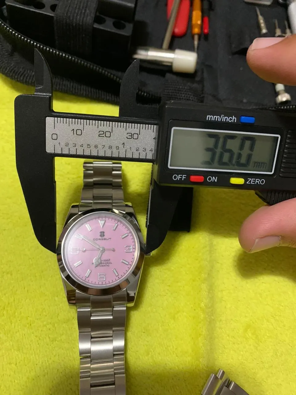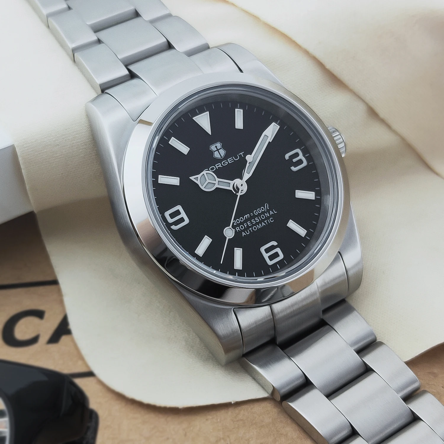 هذه الساعة فاقت توقعاتي. أردت ساعة “إكسبلورر” بحجم 39 ملم، تصميم مستوحى من الطراز الكلاسيكي مع المينا الأسود الأصلي. توجد خيارات عديدة في السوق، لكنني اخترت هذا المنتج تحديدًا بسعر 70 دولارًا أمريكيًا. في رأيي، هذا المنتج يتميز بأفضل المواصفات مقابل أفضل سعر. هيكل وسوار كاملان من الفولاذ المقاوم للصدأ 316L، وصلات صلبة ووصلات نهائية، مقاس دبوس لولبي، مشبك مطحون مع آلية قفل انزلاق سلسة، كريستال الياقوت، تاج لولبي وظهر علبة، ومقاومة للماء حتى عمق 200 متر. اخترت الطراز الأقل تكلفة 8215 بدلاً من NH35. القرص الأسود اللامع عميق وغني للغاية. فقط تحت عدسة مكبرة بقوة تكبير 30x تمكنت من اكتشاف عيوب في تعبئة اللومين على الأرقام. وإلا فإن الطباعة والمؤشرات الأخرى تكون في حالة ممتازة. السوار يتميز بحركة سلسة وقفل انزلاقي فائق السلاسة. أول تجربة لي وأعجبتني. الإضاءة جيدة، والشحن سريع، لكن الأرقام تتلاشى بسرعة. قد يكون هذا الأمر غير مهم بالنسبة للبعض، ولكنه قد يزعج البعض الآخر. قد يكون هناك اختلاف طفيف في درجة لمعان الساعة، حيث أن هيكلها مصقول بالكامل بينما السوار مطفي بالكامل، مما قد يظهر عدم تطابق بسيط عند نقاط التوصيل (lugs). لكنني ما زلت أعتقد أنه رائع وقد أحصل على آخر
